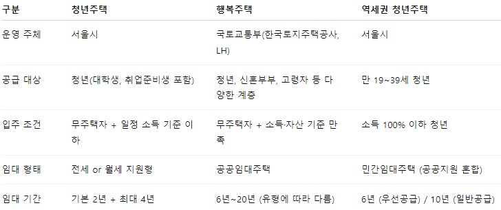 특히 청년주택, 행복주택, 역세권 청년주택은 이름이 비슷하지만 조건과 혜택이 각기 다르기 때문에