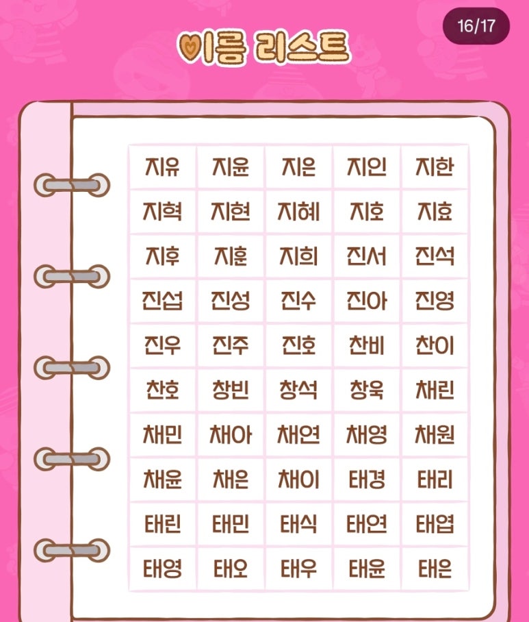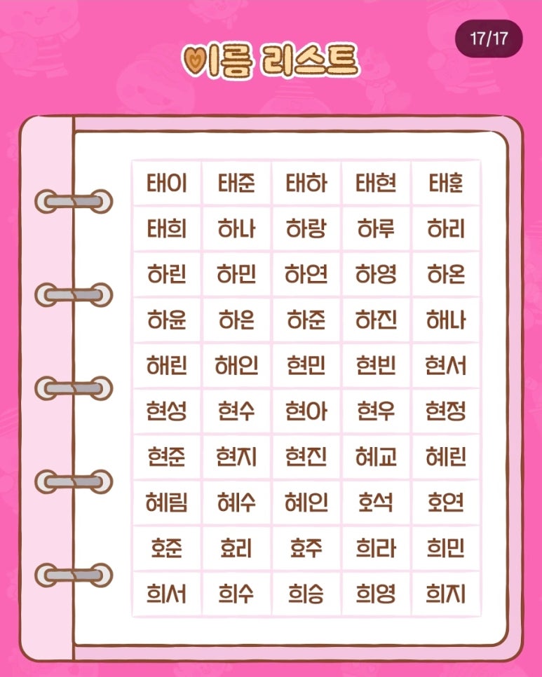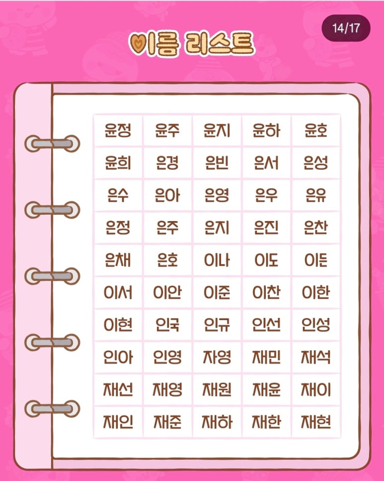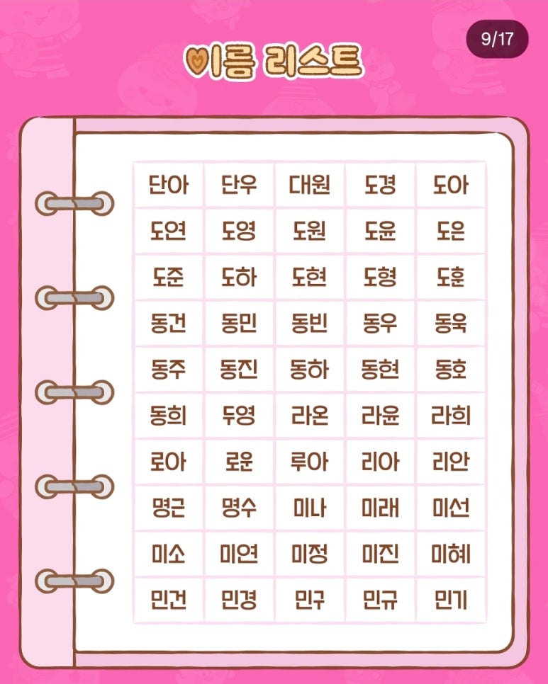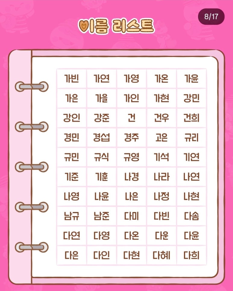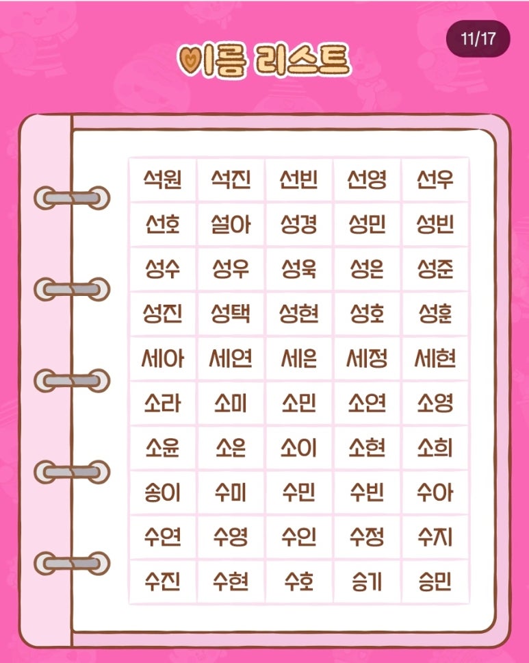 이름 종류: 최근 국내 신생아 인기 이름 500개 + 칸쵸 공식 캐릭터 4명