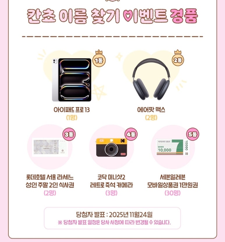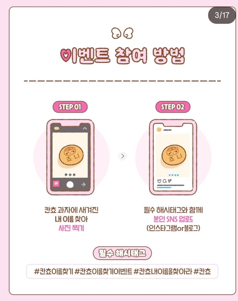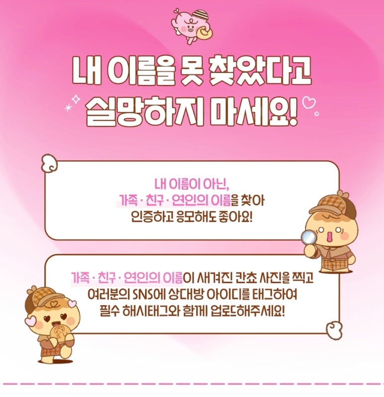 보너스 응모 조건: 두 개 이상의 이름과 ‘하트 칸쵸’를 같이 찍거나 여러 이름 + 하트 조합, 지인 태그 등 하면 당첨 확률이 올라감