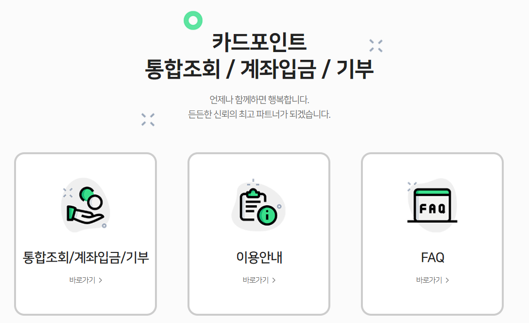 카드포인트통합조회 / 계좌입금 / 기부 언제나 함께하면 행복합니다. 든든한 신뢰의 최고 파트너가 되겠습니다.
