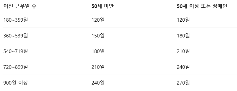 받을 수 있는 기간은 퇴사 전 재직기간과 나이에 따라 다르게 나뉘어요.