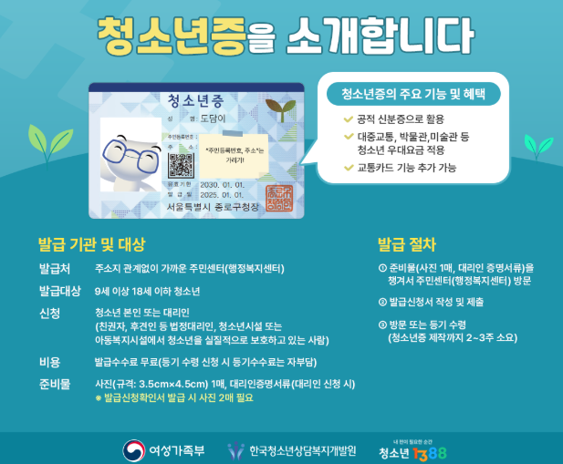국적 상관없이 국내 거주 청소년 (외국인도 발급 가능)