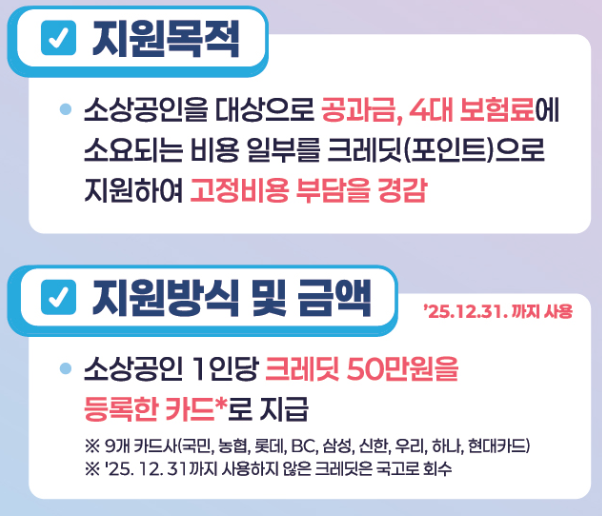 총 9개 항목에 대해 크레딧 사용이 가능해진 것이며, 특히 통신비와 주유비 지원은 일상적으로 지출이 반복되는 항목이라는 점에서 소상공인들의 체감 혜택이 클 것으로 예상됩니다.