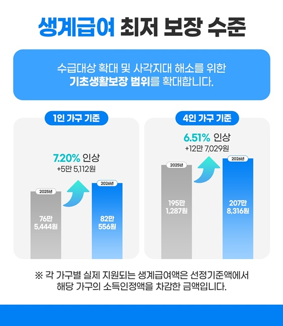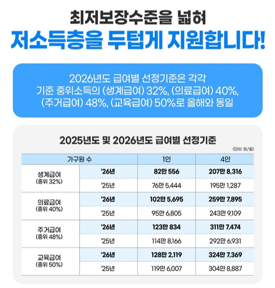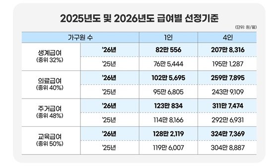2026년도 기준 중위소득은 전년 대비 평균 6~7% 인상되었으며, 이에 따라 생계, 의료, 주거, 교육급여의 선정 기준도 기존 비율(32%, 40%, 48%, 50%)을 유지하면서 각 제도의 최저 보장 수준이 상향 조정되었습니다.