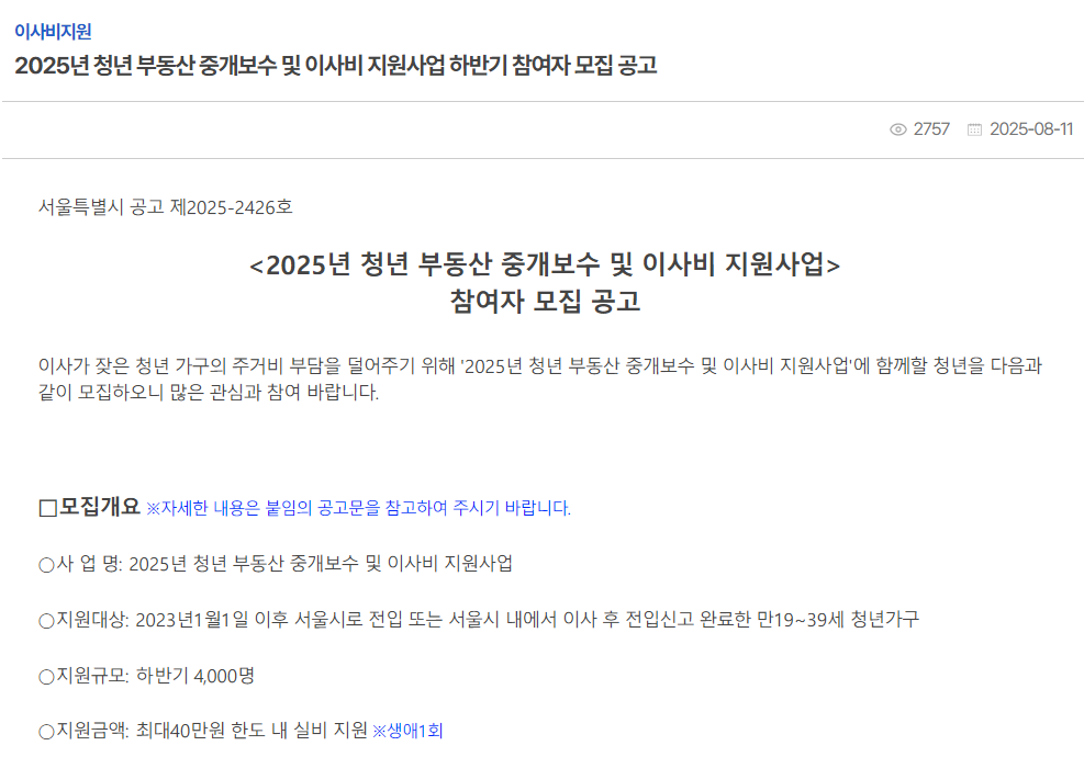 2025 서울시 청년 부동산 중개보수·이사비 지원사업 신청 총정리