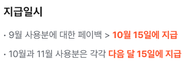 9월 소비분은 10월 15일, 10월 소비분은 11월 15일, 11월 소비분은 12월 15일에 각각 지급되며,