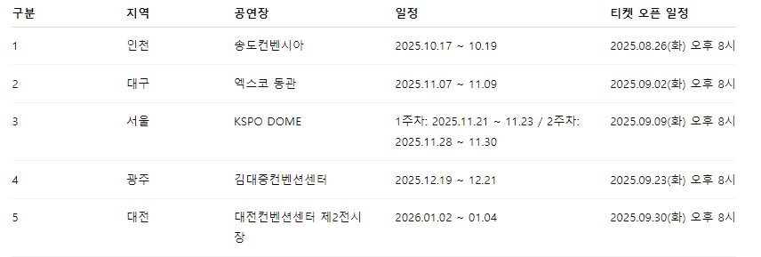 3 서울 KSPO DOME 1주차: 2025.11.21 ~ 11.23 / 2주차: 2025.11.28 ~ 11.30 2025.09.09(화) 오후 8시